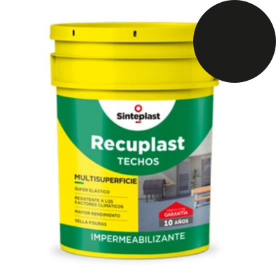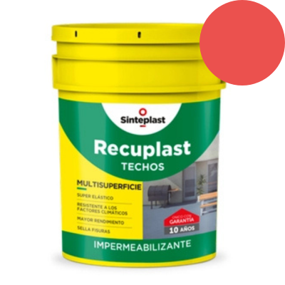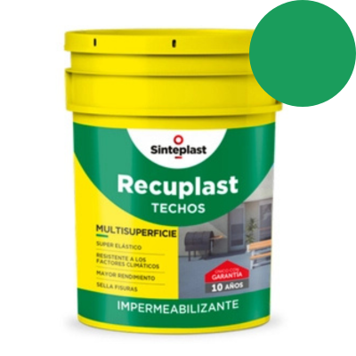 Recuplast Techos es un impermeabilizante acrílico para techos de base acuosa con características de "membrana liquida". Aplicado en el espesor recomendado, una vez seco, forma una película super elástica, alta resistencia mecánica y a los factores climáticos, que impermeabiliza el sustrato por aproximadamente 10 años (de no mediar factores ajenos al producto que deterioren las condiciones iniciales).